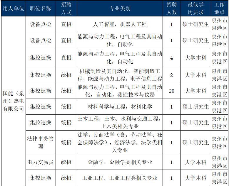 国能(泉州)热电有限公司(简称“国能泉州公司”)成立于2003年8月23日,系中央直属企业国家能源集团的控股三级单位,位于福建省泉州市泉港区,距泉州市区50公里,地处泉港国家级石化工业区热负荷中心。现有发电装机容量为194万千瓦,其中一期工程建设2台30万千瓦国产燃煤机组;二期扩建2台67万千瓦国产燃煤机组。目前,公司三期2台66万千瓦燃煤机组已顺利通过集团公司投资决策,预计于2025年底动工,2028年投产。公司为员工提供免费宿舍和市内通勤车,已开通福州、厦门周末往返班车,为员工足额缴纳“六险两金”、提供带薪年假等福利。