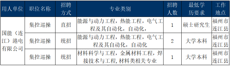 国能(连江)港电有限公司(简称“国能连江公司”)位于福建省福州市连江县可门港,地理位置优越,交通便利,距离市区约80公里。一家集大型火力发电厂、电厂储煤场及码头为一体的“港储电一体化”企业。国能连江公司认真践行“健康国能”要求,打造吃、住、行“智慧后勤”,为员工提供舒适的办公、生活环境,配备齐全的运动设施及场所。员工值班宿舍实行公寓式管理,食堂打造“智慧健康食堂”,并为员工提供县、市两级通勤班车,建设光伏充电车棚,打通“回家最后一公里”。“六险两金”、津补贴、带薪年假等福利待遇一应俱全。